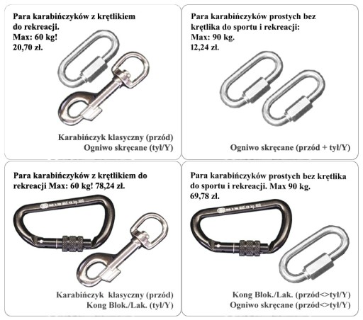 У базовому виконанні ніжки для амортизованих мотузок закінчуються люверсами (без карабінів). Через кількість комбінацій користувач вибирає їх види окремо. Однак, щоб полегшити роботу, в пропозиції Allegro ми пропонуємо готові набори з найбільш часто використовуваними формами закінчень, які використовуються як у спорті, так і на відпочинку - вони доступні безпосередньо в наборах цієї пропозиції в розділі «Купити разом». :