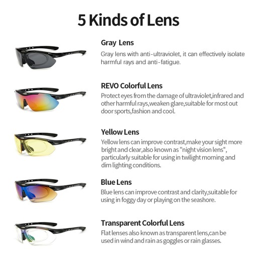 Спортивні окуляри оснащені аж 5 різними змінними лінзами. Кожен з них був розроблений для роботи в певних погодних умовах. Базовий - чорний забезпечить ще кращий контраст і, перш за все, ефективний захист від УФ-А та УФ-В променів. Змінні лінзи представлені в таких кольорах: