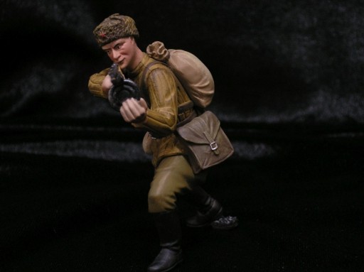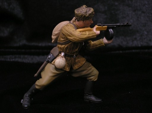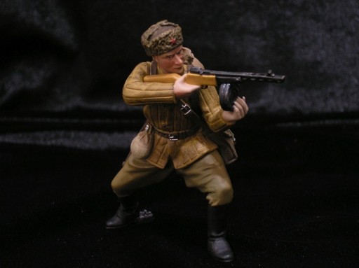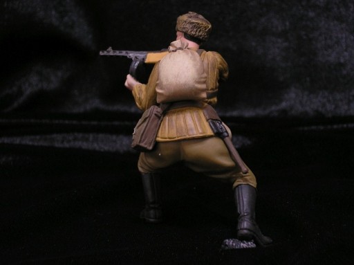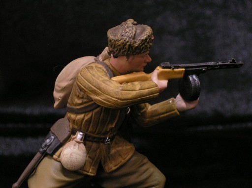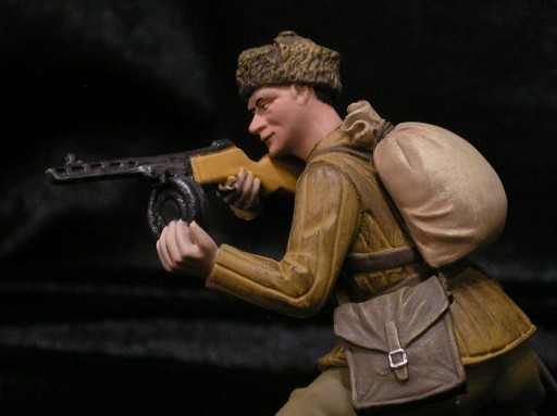 Переломним для долі кампанії на сході стали бої за Сталінград (серпень 1942 — лютий 1943 рр.), в результаті яких Червона Армія захопила стратегічну ініціативу, яку не поступалася до кінця війни. Радянська уніформа відрізнялася простотою і великою зручністю. Приватний будинок називається tielogrielka (також називається watnik) виготовлена з міцної бавовняної тканини кольору хакі, підбита бавовною-сирцем і прошита смугами. Тієлогрелки замінили незручні суконні кожухи (шинелі). На голові шапка-ушанка зі штучного хутра, яку носять з 1941 року замість менш практичної гострокінцевої суконної будьонівки. Утеплені штани у вигляді бриджів, шкіряне взуття (при низьких температурах використовували також повстяні підзори). Основний пояс тканинний, економний. Спорядження складається з рюкзака, лопати, буфета та протигаза. Озброєння — пістолет-кулемет PPSz 41 калібру 7,62 мм (барабанний магазин, 71 патрон).