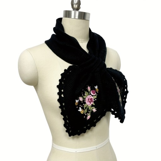 Вінтажний в'язаний шарф із квітковою вишивкою, елегантний шарф із видовбаним хрестиком
