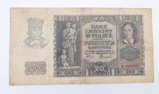 Стара колекційна банкнота Польща 20 злотих 1940 р