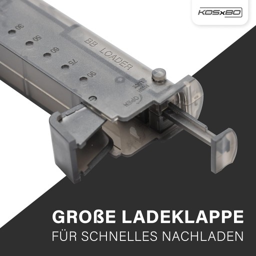 - Завантажувач – цей швидкісний страйкбольний зарядний пристрій призначений для 6-мм патронів BB, на кінці спідлодера є великий отвір для вставлення страйкбольних BB.