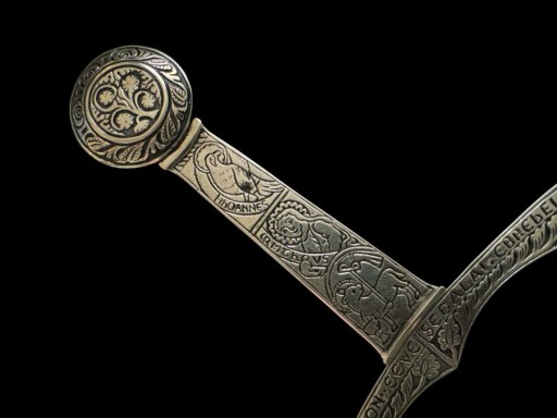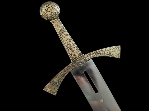 Золота ручка, багато прикрашена орнаментом (спочатку в техніці чернь) із символікою Агнця Божого, євангелістів та мотивом виноградної лози (голова та хрестовина). Голова на аверсі має тетраграмматон — літери альфа і омега грецького алфавіту та латинський напис «REC. ФІГ.ВРА. ТАЛЕТ. AD AMOREM. REGVM. ET. ПРИНЦИПВМ. IRAS IVDICV. М» що означає «цей знак зміцнює любов королів і князів і гнів суддів». Хрестовина на аверсі має латинський напис «QVICVMQVE hEC + NOMI[N]A DEII SECVM TVLERI[T] NVLLVM PERICVL[VM] CN EI OMNINO NOC[E]BIT» («хто носить із собою ці імена Бога, буде у жодній небезпеці в не зашкодить взагалі) і на звороті «CON. CITOMON.. EEVE SEDALAI. EBREbEL» палка віра натхненна іменами бога Седалай і Ебрехель» та орнаментом виноградної лози. Клинок має проріз для розміщення в ньому реліквії. Репліка з високовуглецевої толеданської сталі