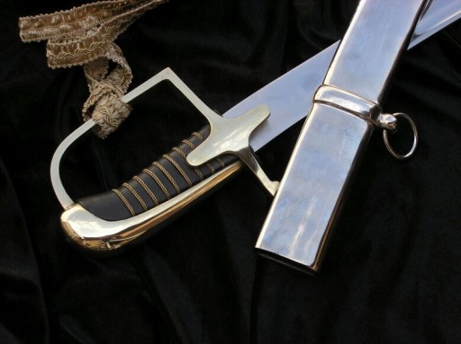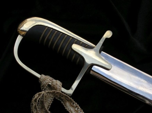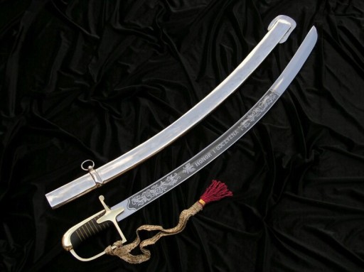 Ручка виготовлена з дерева, обшита чорною шкірою і переплетена золотою ниткою. Капюшон і поперечина також золотисті, з гладкою поверхнею без будь-якого орнаменту. Клинок прикрашений з одного боку. Між квітковими прикрасами розміщено польський орел і напис «HONOR HOMELAND». Крім того, оригінальна шабля мала фірмовий знак під вусами – характерну білку та напис Carl Eickhorn Feather blade.