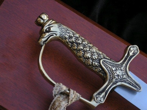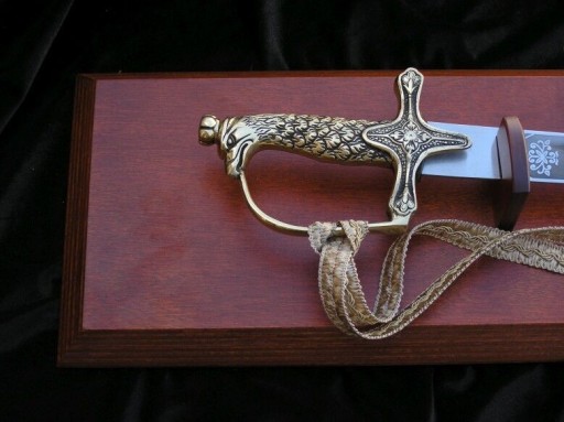 Шабля має повністю закриту ручку, відлиту в одній формі. Хрестовина дещо загнута всередину, хрестоподібна, прикрашена рослинним орнаментом на тлі луски коропа. Держак і головка руків'я мають форму погруддя орла з короною.