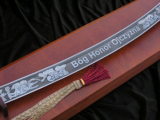 На одній стороні клинка вигравірувано напис «Бог честь Батьківщину», інша сторона клинка гладка, пристосована для гравірування.