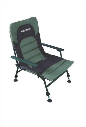 Якісний рибальський стілець зі спинкою Mistrall. Дуже легко розкладається, він має телескопічні, висувні та регульовані ніжки, оснащені опорами, які запобігають просіданню стільця в землю. Регульовані ніжки дозволяють пристосувати крісло до нерівності місцевості кожного місця риболовлі. Каркас крісла виготовлений з міцного круглого профілю 22 мм, а сидіння та спинка виготовлені з надміцного нейлону. Всередині матеріалу вшита м'яка губка, що робить крісло дуже комфортним. Крісло має надшвидке регулювання кута нахилу спинки за допомогою багатохрапового механізму. Є можливість розкласти крісло до повністю лежачого положення.