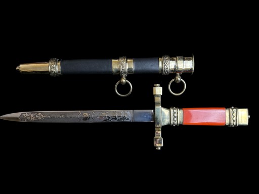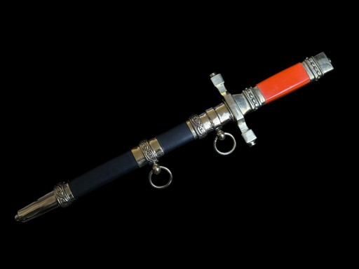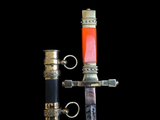 Клинок полірований з високовуглецевої сталі з ромбоподібним перерізом. Довгий лад, центричне гравіювання. На зовнішній поверхні вигравіруваний орнамент із зображенням державного герба та написом «Честь і Батьківщина». Пряма профільована хрестовина з центральним розширенням і чотиригранними наконечниками. Поперечний перетин хрестовини чотиригранний, за винятком напівкруглих кінців рамен. Нижнє кільце древка чотиригранне, розширене донизу з декоративним кільцем угорі з орнаментом. Ручка червоно-помаранчева, чотиригранна в перерізі із закругленими краями. Голова з декоративним кільцем з орнаментом. Металеві елементи: латунні ручки. Піхви поперечного овального перерізу, дерев’яні з кожухом чорного кольору і трьома латунними фурнітурами. Верхня фурнітура з дугоподібним вхідним манжетом, гладкою виточкою з ланкою і рухомим опорним колесом, внизу декоративним кільцем з орнаментом. Центральна арматура з пазом, прикрашеним орнаментом, з ланкою та рухомим опорним колесом.
