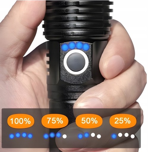 На ліхтарику є 4 рівні заряду, кожна смужка відображає певну частину заряду, що дозволяє користувачеві швидко оцінити, скільки енергії залишилося.