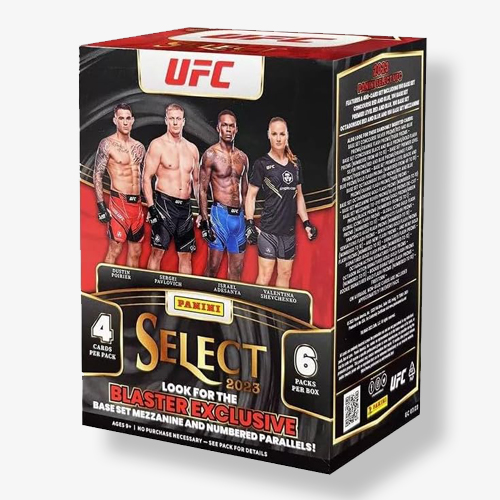 2023 Panini Select UFC повертається з абсолютно новим, довгоочікуваним урожаєм новачків, які, безсумнівно, змусять колекціонерів із захватом додати цих майбутніх зірок до своїх колекцій! Зберіть ексклюзивний базовий набір Mezzanine, ексклюзивний для Blasters. У коробці ви знайдете в середньому 6 вставок або призм. Також шукайте дуже рідкісні вкладиші Firestorm - 6 упаковок у коробці - 4 карти в упаковці - У середньому 6 вкладишів/призмів у коробці!