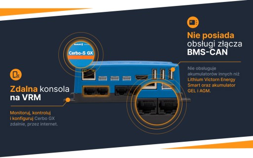 Cerbo GX. Дозволяє контролювати всі пристрої Victron Energy через Інтернет або додаток Victron Connect. Він також дозволяє підключати сенсорний дисплей GX Touch 50. Зверніть увагу, що версія S не підтримує вихід BMS-CAN і виходи для датчиків рівня рідини. Призначений для роботи з акумуляторами LiFePO4 Victron Energy і GEL або AMM