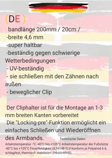 -профільована застібка, яка змушує краватку затягуватись на дуже тонкому предметі Ось технічні дані кабельної стяжки CLK2: