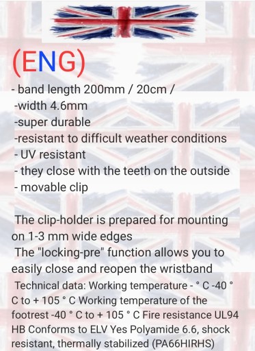 Кабельна стяжка CLK2 виготовлена з поліаміду 6.6, який є ударостійким і термостабілізованим (PA66HIRHS), що робить її дуже міцною та довговічною. Цей ремінець також відповідає вимогам протипожежного захисту UL94 HB і відповідає директиві ELV. Робоча температура ремінця від -40 °C до +125 °C, робоча температура підніжки також від -40 °C до +105 °C.
