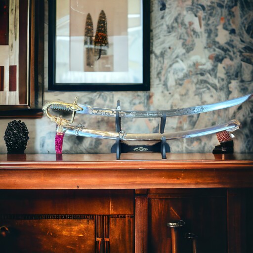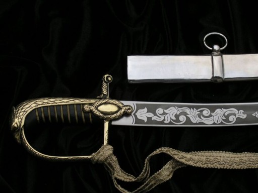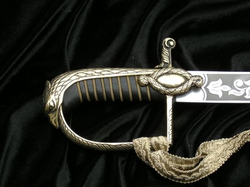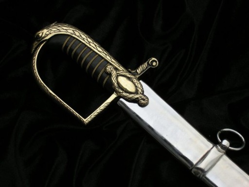 Ця шабля має повністю закриту латунну ручку з бантом, прикрашеним філігранню, і капюшон у вигляді голови орла. Хрестовина прикрашена мотивом мотузки. До лука кріпиться стропа.