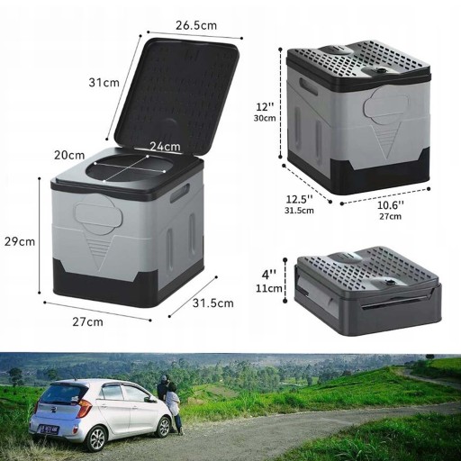- Складаний унітаз повністю функціональний і має кришку, яка дозволяє перемикатися між використанням, таким як кемпінговий туалет, табурет, кошик для речей або відро для сміття.
