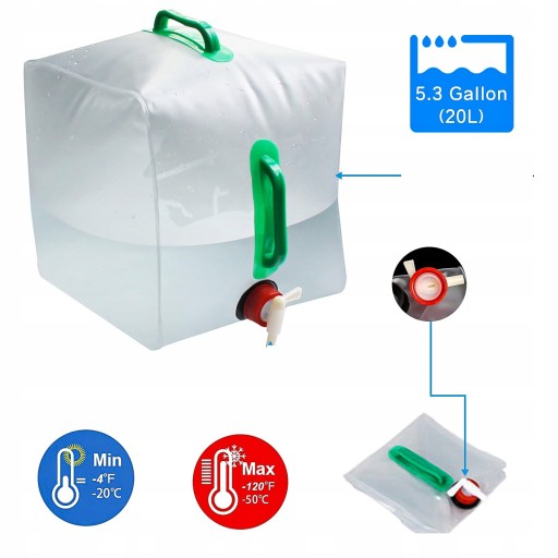 - 🟢Ідеально підходить для активного відпочинку на природі, наприклад для кемпінгу, походу, полювання, автофургону, туристичного туризму, риболовлі, пікніків, спорту, барбекю, вечірок і пляжу. Це також дозволяє швидко зберігати воду на випадок надзвичайних ситуацій або стихійних лих, таких як ураган, торнадо, повінь, посуха тощо.