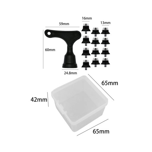 [ПАКЕТ]: Ви отримаєте 12 шипів для взуття (8 шипів 13 мм, 4 шпильки 16 мм, 1 шт. гайкового ключа), яких достатньо, щоб замінити старі або пошкоджені шипи у ваших футбольних бутсах.