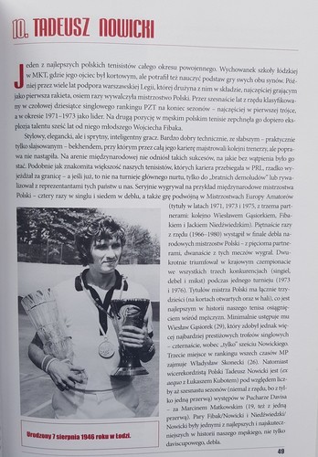 : Книга Томаша Вольфке – редактора та спортивного журналіста з майже 40-річним професійним досвідом, заступника головного редактора «Przegląd Sportowy», експерта з тенісу. У книзі, виданій до 100-річчя Польської тенісної асоціації, автор представляє 100 найкращих польських тенісистів. У книзі ви можете прочитати про відомих сучасних спортсменів, таких як Іга Свёнтек, Агнешка Радванська, Марта Домачовська, Губерт Гуркач, Лукаш Кубот і Єжи Янович, а також про гравців минулих років, таких як Войцех Фібак, Ядвіга Єнджейовська, Владислав Сконецький, Лех Сидор, Казімєж Тарловський, Юзеф Пьонтек та ін. Заключна частина книжки містить статистичні списки: поляки на найвищих місцях у рейтингах WTA та ATP, польські переможці міжнародних турнірів, тенісисти у списках найкращих польських спортсменів тощо. Усе це багато ілюстроване обома кольорами і чорно-білі фотографії.