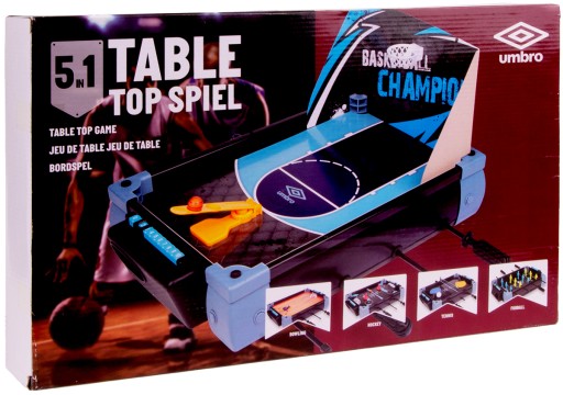 - У набір входять ігрові елементи: настільний футбол, настільний теніс, аерохокей, боулінг і баскетбол