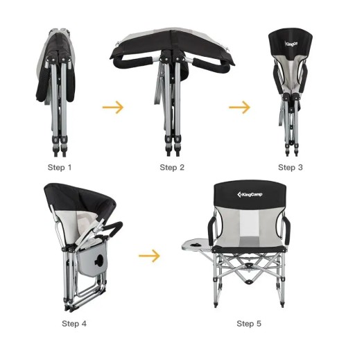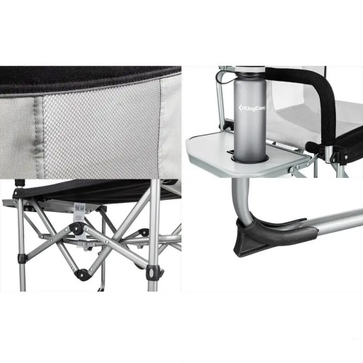 Крісло KING CAMP Director Folding Camping Chair - воно легке та портативне. Його можна використовувати як для заходів у приміщенні, так і на відкритому повітрі, таких як пікніки, пляж або спортивні заходи. Він має сітку з тканини Оксфорд на поверхні стільця, з хорошою повітропроникністю та довговічністю. Розкладний столик з вбудованим підстаканником може вмістити телефон, закуски, склянки і т. д. Ніжки оснащені великими спеціально профільованими накладками, щоб зробити стілець більш стійким. Сидіння, спинки та підлокітники оббиті подвійною бавовняною підкладкою для більшого комфорту.