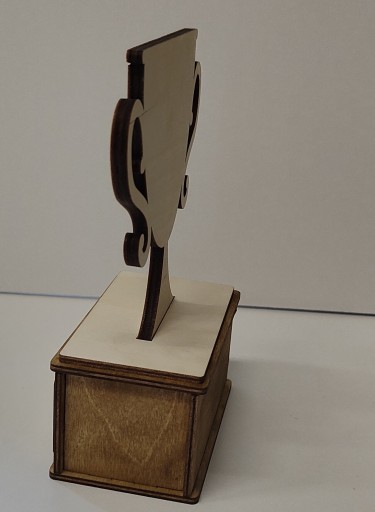 Оригінальна, красива і неповторна статуетка виготовлена з комбінації чистої та просоченої фанери кольору дуб. Крім того, ламінат з гравіюванням доповнює все.