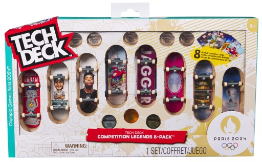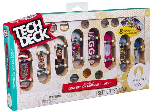 - Tech Deck Competition Legends 8-Pack: містить вісім колод із культовими дизайнами колод від найкращих олімпійських спортсменів, у тому числі: Шейна Онейла, Рясса Ліла, Юто Харігоме, Марії Дюран, Джаггера Ітона, Орельєна Жіро, Феліпе Густаво та талісмана Олімпіади.