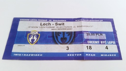Квиток LECH Познань - ŚWIT Nowy Dwór Maz 29/10/2003