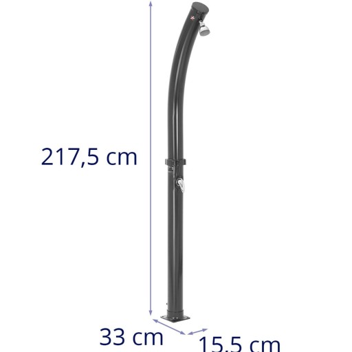Сонячний садовий душ Uniprodo дозволить вам насолоджуватися великим простором для миття на відкритому повітрі, не покладаючись на звичайні джерела енергії. Сонячні душі особливо підходять для садів, відкритих плавальних басейнів, курортів і кемпінгів, де вони забезпечують ефективну та стійку альтернативу звичайному нагріванню води. Великий резервуар об'ємом 20 літрів ідеально підходить для тривалого душу. Залежно від погоди та місця розташування температура води досягає 35, 45 або 60°C. Вбудований кран дозволяє зручно встановлювати бажану температуру від холодної до теплої або гарячої. Велика душова лійка діаметром 65 мм легко регулюється і виготовлена з ABS-пластику з високоякісною хромованою поверхнею. Завдяки дошці 15,5 х 15,5 х 0,8 см встановити душ дуже легко. Внизу знаходиться перехідник для підключення стандартних садових шлангів. Найкраще вибрати місце з найбільшою кількістю сонця, щоб за короткий час досягти потрібної температури води.