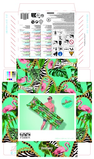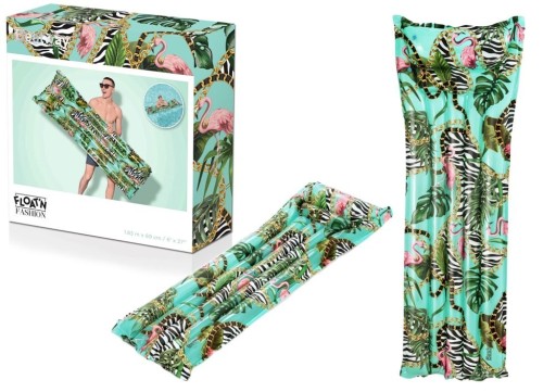 Пляжний матрац м'ятного кольору з графічним мотивом рожевих фламінго і принтом зебри радує своєю оригінальністю. Це зробить ваше перебування на пляжі, у басейні чи у домашньому саду ще приємнішим! Строкатий малюнок неодмінно приверне увагу оточуючих. Виготовлений з міцного вінілу, він витримує одну дорослу людину (до 90 кг). Матрац оснащений двома запобіжними клапанами, які захищають від несподіваного скачування повітря.