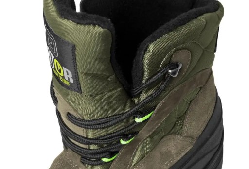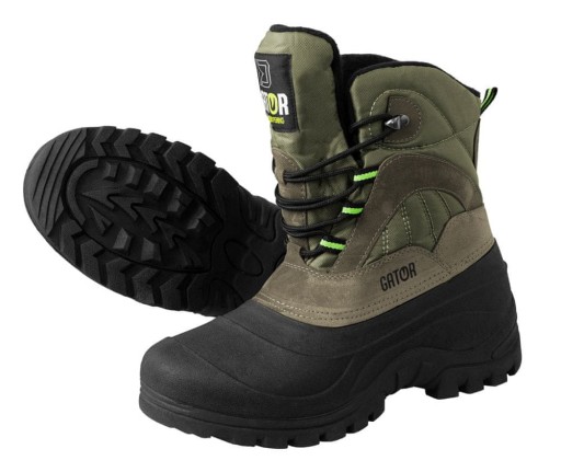 Взуття Delphin GATOR створене для екстремальних експедицій, особливо в холодну пору року. Піднятий гумовий край підошви доходить до щиколотки, тому ходити по болотах, талому снігу та грязі для GATOR не проблема. Цю гумову частину також дуже легко чистити. Верх у цьому стилі – це поєднання міцної нейлонової тканини та штучної шкіри. Ці матеріали стійкі до негоди і при необхідності їх легко просочити. Язичок черевика вшитий на висоту 17 см, що дозволяє недовго пересуватися в таких глибоких сирих місцях. Шнурівка - це рішення через текстильні люверси, у верхній частині шнурівки є одне металеве вушко. Внутрішня частина взуття виконана зі зручного мікрофлісу. Тепловий комфорт забезпечує шар штучної мікрофібри між зовнішнім і внутрішнім шарами. Чорно-зелене поєднання матеріалів оцінять не тільки рибалки, а й мисливці, туристи та всі інші любителі природи. Незважаючи на свою міцність, взуття дуже легке, що неодмінно стане в нагоді під час тривалих прогулянок. Наприклад, обидва туфлі 43 розміру важать лише 1200 г.