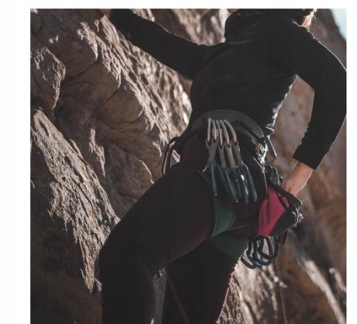 Запобіжний ремінь для скелелазіння: збоку від ременів є 2 крючки для спорядження та 2 D-кільця, гачки для спорядження дуже міцні, на них легко підвішувати інше альпіністське спорядження, яке захищає вас під час скелелазіння Пряжка дозволяє швидко і легко відрегулювати ремінь стегна і стегна