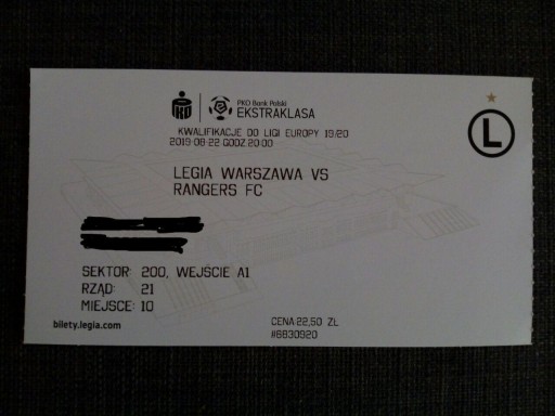 Колекційний квиток Легія Варшава - Рейнджерс 22.08.2019