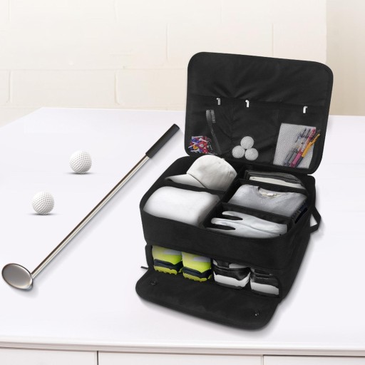 [Велика ємність] Розмір цієї сумки-органайзера для гольфу становить 45 см x 34,5 см x 24 см/17,72 дюйма x 13,58 дюйма x 9,45 дюйма. У головному відділенні є 3 сітчасті кишені та еластичні ремінці, яких достатньо для зберігання аксесуарів для гольфу, таких як щітки для гольфу, м’ячі для гольфу, рушники, шкарпетки, взуття, капелюхи, рукавички тощо.