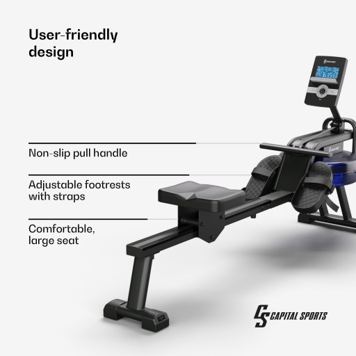 Алюмінієва рейка довжиною 95 см із пластиковою направляючою водного гребця Oceanus від CAPITAL SPORTS також забезпечує приємне, тихе тренування. 4-ступеневе регулювання підніжок гарантує стабільне положення стопи. Після тренувань гребний тренажер дуже просто і компактно зберігати. Просто розташуйте його вертикально, і він займе не набагато більше місця, ніж стілець. Завдяки колесам його можна вільно переміщати.