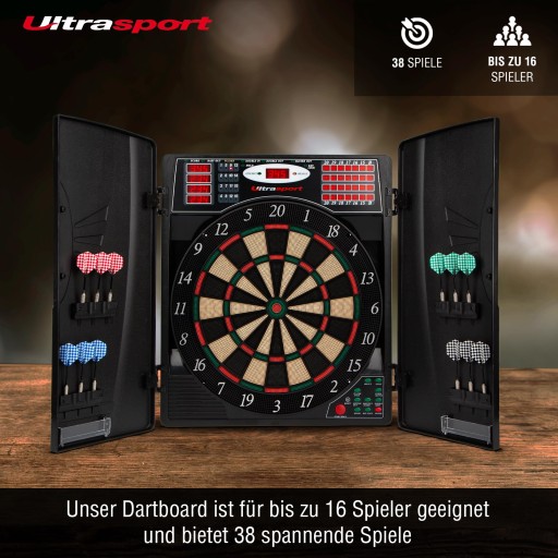 Відвідайте магазин Відвідайте магазин Електронний дартс Ultrasport — це найсучасніший ігровий пристрій, який поєднує традиційний дартс із сучасними технологіями. Завдяки світлодіодному дисплею він пропонує широкий вибір ігрових варіантів і форматів підрахунку очок для гравців будь-якого рівня кваліфікації. Дартс був розроблений для довговічності та точності, а дротики з м’якими наконечниками забезпечують безпеку під час гри. Зручний інтерфейс і багатокористувацькі можливості роблять пристрій привабливим вибором для рекреаційних гравців у дартс і змагань, які хочуть захоплюючого та інтерактивного досвіду. На дошці доступно 38 ігор різних видів, включаючи найпопулярніші ігри, такі як 301 Single Out, SCRAM, SHOOTER і Shanghai. Незалежно від того, граєте ви один або з 16 гравцями одночасно, ви можете встановити сім різних рівнів гучності, а вбудований світлодіодний дисплей дозволить вам завжди стежити за рахунком. Наші світлодіодні дисплеї пропонують вищу яскравість, кращу контрастність і вищу енергоефективність порівняно з іншими РК-дисплеями. Пристрій поставляється з блоком живлення, тому ви можете легко підключити його і грати з вашими близькими. Дартс з комп'ютерним керуванням подвійним і потрійним полями можна захистити від бруду завдяки двом дверцятам, які щільно закриваються. Після гри ви можете розмістити дротики за дверима. Обертайте стрілки за годинниковою стрілкою, видаляючи їх з дошки. Це подовжує термін служби наконечників і полегшує видалення дротиків. Наш дартс можна повісити менш ніж за дві хвилини. У набір входить 12 м'яких дротиків, 100 запасних м'яких наконечників і блок живлення. Наш дартс має бути підвішений у вільному просторі 3,04 метри та має наклейку зі стартовою лінією, яку слід розмістити на відстані 2,37 метра від дартсу, щоб забезпечити його ідеальне використання. Диск оснащений 12 інтерактивними кнопками, такими як функції блокування живлення, START/HOLD, SOUND, CYBERMATCH і GAME GUARD. Дартс оснащений великим кільцем для захоплення, яке оптимально захищає стінки від рикошетних дротиків.