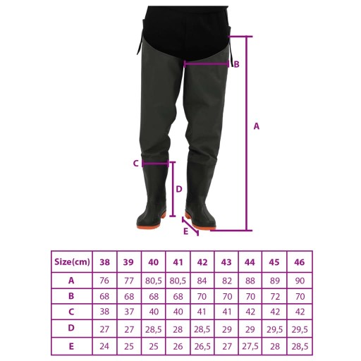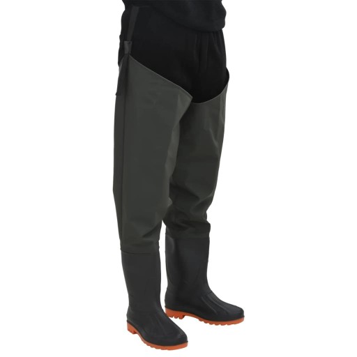 Ці кульки міцні та гнучкі, підходять для риболовлі, полювання, сільського господарства тощо. Регульовані та зручні: ці мотузки для риболовлі мають регульовані ремені, завдяки яким їх легко та швидко одягати та знімати. Крім того, ремінці забезпечують ідеальну посадку та оптимальний комфорт при носінні: ця поліефірна тканина зі спеціальним покриттям м’яка всередині та міцна зовні. Завдяки стьобаним і проклеєним швам і прикріпленим черевикам, ці вейдерси водонепроникні. Різноманітне застосування: стегнові вейдерси з черевиками - чудове спорядження для рибалок і фермерів, вони також ідеально підійдуть для прогулянок у лісі, за містом, на полюванні тощо.