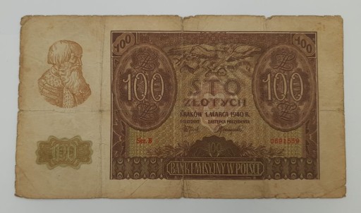 Стара колекційна банкнота Польща 100 злотих 1940 р