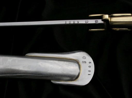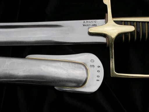 Рукоятка закрита, окантовка латунна. Наконечник арбалета з вусами. Переднє плече хрестовини, зігнуте під прямим кутом, доходить дугою до навершя. Заднє плече закінчується сплощеною сльозою. нахилена вперед, покрита заокругленим капюшоном, що доходить до хрестовини, дерев'яна рукоятка, хрестоподібно рифлена, обшита чорною шкірою, з опліткою з латунної лопатки в основі велика кривизна, відшліфована з обох сторін з одним краєм, з тонким підписом виробника кістки A.MANN/WARSZAWA/AMA. ) і пункт технічного прийому S (інспектор підполковник Болеслав Сікорський асиметричний з штампованим номером від 1001 (за зростанням) і пунктом технічного прийому S і номером AMA"1).