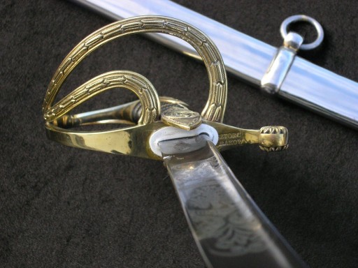 Клинок з нікельованої сталі, з невеликою кривизною, плоско заточеними пластинами з валикоподібним хребтом. Перо з кісточкою з острижка клинка, децентричне гравіювання. На зовнішній стороні леза, біля основи, підпис виробника WEYERSBERG / SOLINGEN, внизу – гравійований позолочений декор із мотивом листя та коронованим орлом і написом FOR FAITH / AND THE FAITH. На внутрішній поверхні, також з рослинним декором, розміщено позолочений картуш із зображенням Богородиці з Немовлям і написом ПІД ТВОЮ ЗАХИСТОЮ. Поліровані сталеві піхви з двома пазами та рухомими колесами. Асиметрична шпора. Шийка піхви рифлена».1.