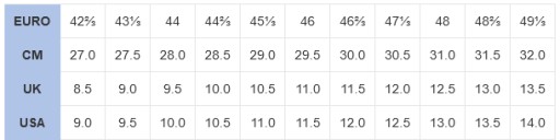 - Вибір розміру: 38, 38 2/3, 39 1/3, 40, 40 2/3, 41 1/3, 42, 42 2/3, 43 1/3, 44, 44 2/3, 45 1/3 , 46, 46 2/3, 47 1/3