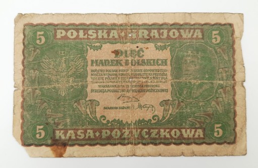 Стара колекційна банкнота номіналом 5 польських марок Польща 1919 року
