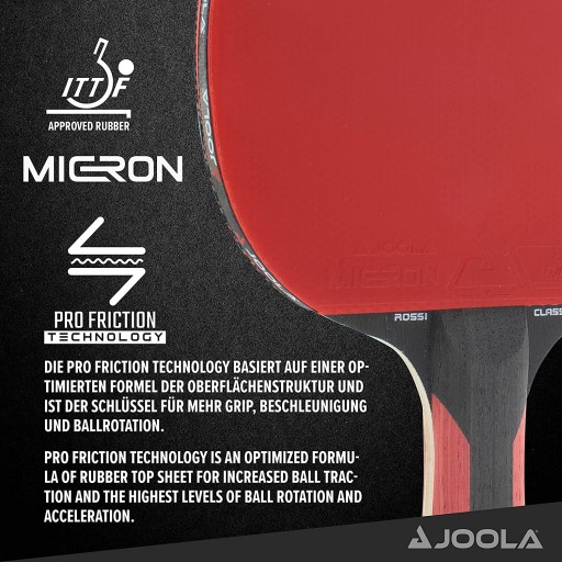 Дошка: 5-шарова фанера Гума: MICRON Губка: 2,0 мм Обертання: 111 Швидкість: 109 Контроль: 109 Клас якості: 6 зірок Схвалено ITTF (Міжнародна федерація настільного тенісу): так Вага нетто: 0,2 кг Вага брутто: 0,217 кг Матеріал: дерево, губка, гума Розміри ракетки 15 x 1,5 x 25,5 см (ширина x глибина x довжина) Приблизні розміри ручки: 3,5 x 2,5 x 8,5 см (ширина x товщина x довжина) Колір: чорний, червоний, дерево Розміри упаковки (картонний блістер) ): 15,2 x 2,7 x 28,5 см (ширина x глибина x висота) Бренд: Joola Модель: ROSSI CLASSIC