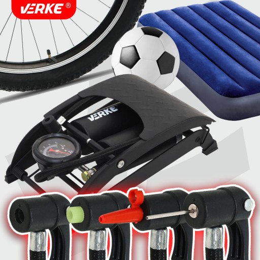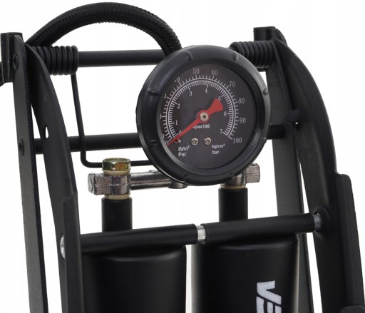 Двопоршневий ножний насос VERKE. Насос міцної конструкції, виготовлений з тисненого лакованого сталевого листа товщиною 3 мм. Ніжки насоса покриті гумою для кращої стабілізації. Зручний для читання манометр, який показує бар (0-7) і PSI (0-100). Міцний і гнучкий шланг довжиною 550 мм. Поставляється з трьома адаптерами. Ідеально підходить для професійних послуг і домашніх господарств.
