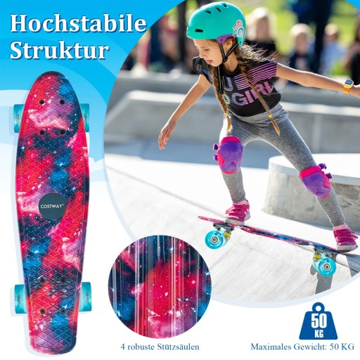 Веселий і функціональний подарунок: цей 56-сантиметровий скейтборд із привабливим малюнком галактики на поверхні стане ідеальним подарунком для хлопчиків і дівчаток віком від 6 років для розвитку навичок рівноваги та відчуття орієнтації. У той же час цей крейсерський скейтборд простий у вивченні та підходить для скейтерів будь-якого рівня кваліфікації.
