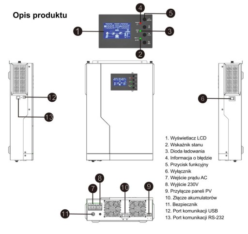 Інвертор живить підключені приймачі, отримуючи енергію від мережі 230 В або підключених батарей або підключених фотоелектричних панелей.