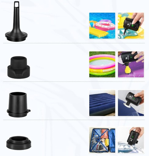 🔫🔫🔫【4 різні насадки】 Електричний повітряний насос оснащено 4 різними типами насадок, щоб задовольнити ваші різні потреби в накачуванні. Ідеально підходить для надувних матраців, надувних басейнів, кілець для плавання, дитячих басейнів, м'ячів для йоги та інших надувних предметів. Його також можна використовувати для видалення зайвого повітря з вакуумних пакетів.