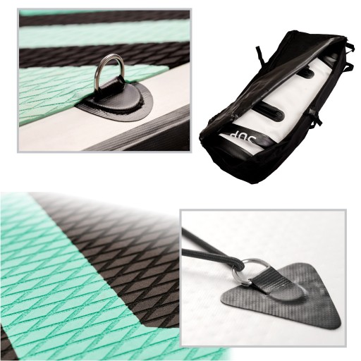 ➡️Гак для мотузки також стане в нагоді, наприклад, для прив'язки дошки до пірсу. У передній частині борту встановлений багажник, куди ми можемо транспортувати найнеобхідніші речі або прикріпити весло під час швартування. Завдяки використаним технологіям безпеки дошку можуть використовувати як новачки, так і досвідчені любителі спорту.