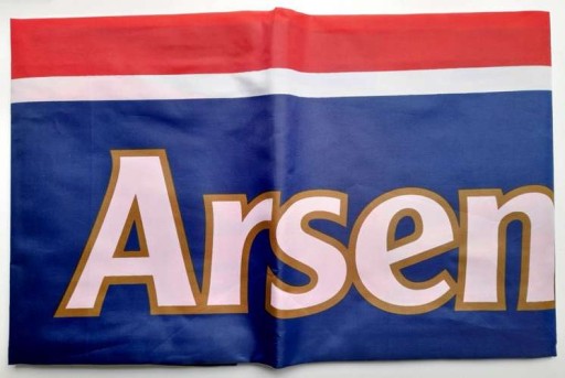 : Великий прапор, випущений англійським футбольним клубом Арсенал Лондон (розміри 152 х 91 см). На ньому зображено герб клубу з його назвою на тлі його кольорів. На одній із менших сторін прапор має шов разом із двома металевими кільцями з отворами, що дозволяє повісити його на древку чи древку. Він виготовлений з поліестеру і поміщений в упаковку з гербом ФК «Арсенал» і голограмою клубу. Це офіційний сувенір Лондонського клубу.