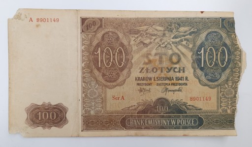 Стара колекційна банкнота Польща 100 злотих 1941 р