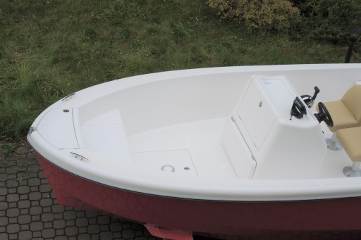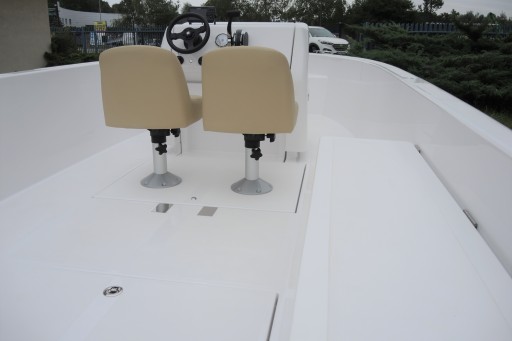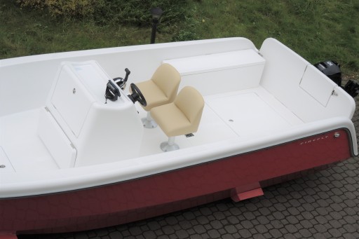 Firefly має дуже простору та зручну палубу - ідеальне місце для прийняття сонячних ванн та відпочинку. Він також ідеальний і дуже безпечний для дітей - закритий ззаду і обрамлений високими бортами кабіни. У задній частині човна є платформа для купання з драбиною, яка розкладається і ховається в касету. Доступ до платформи полегшують розсувні ворота. Простора консоль з панеллю управління і два м'яких сидіння забезпечують зручну навігацію. Крім рульового колеса і керма, на панелі знаходяться міні-навантажувач, індикатор обертів двигуна з лічильником годин, індикатор рівня палива, індикатор заряду акумулятора, кнопка звукового сигналу, вимикачі світла (навігація плюс якір), перемикач освітлення кабіни та два USB-порти для зарядки телефонів і т. д. У верхній частині консолі розташована містка полиця для дрібниць і екран сонара з вбудованим GPS. У передній частині консолі розташоване розкладне, дуже практичне сидіння для двох осіб, а над ним місткий відсік для ручної поклажі екіпажу з розеткою 12 В для перетворювача напруги 150 Вт. У носовій частині розташований якірний відсік з додатковими бічними відсіками для зберігання крил, а відразу за ним дуже місткий форпік з розеткою 12 В для живлення портативного холодильника. Під підлогою два містких багажника - в передньому хімічний туалет, а в задньому можна розмістити стіл, якщо він не потрібен. Є технічні місця під сидіннями та всередині консолі. У ньому також можна розмістити додаткові паливні каністри та менш потрібний багаж.